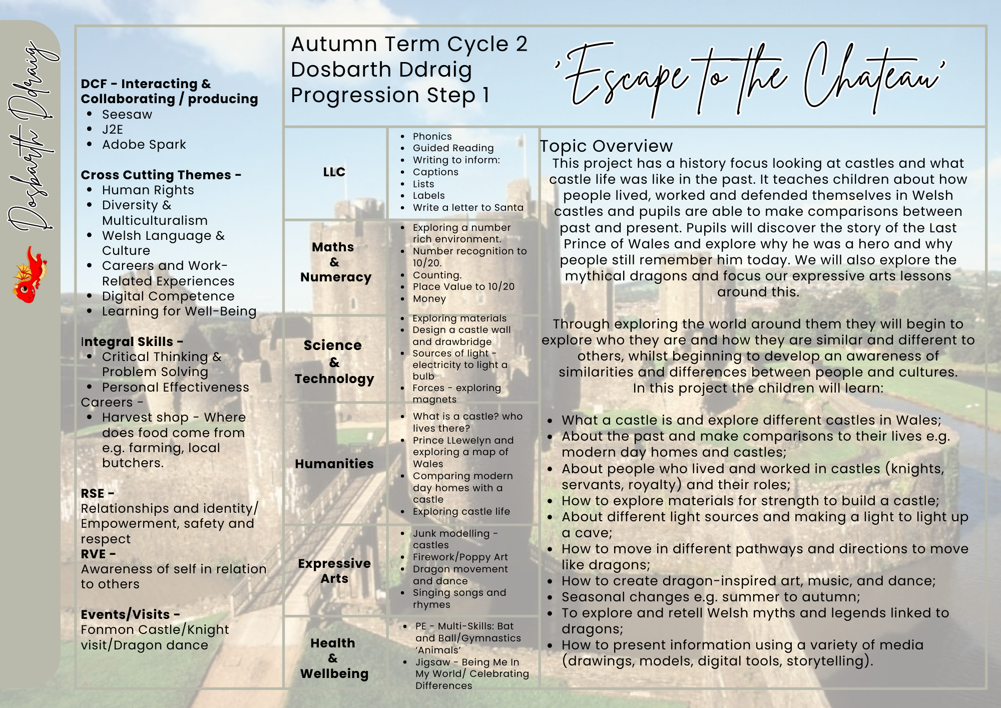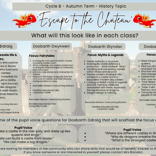 Our topic for the Autumn term is 'Escape to the Chateau' and our focus for this will be Castles, castle life and dragons.