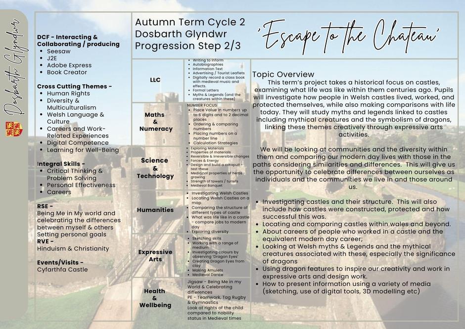 This term’s project takes a historical focus on castles, examining what life was like within them centuries ago. Pupils will investigate how people in Welsh castles lived, worked, and protected themselves, while also making comparisons with life today. They will study myths and legends linked to castles including mythical creatures and the symbolism of dragons, linking these themes creatively through expressive arts activities.