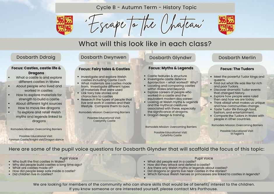 Our whole school topic for the Autumn is 'Escape to the Chateau' and our focus for this will be based around castles, myths & legends.